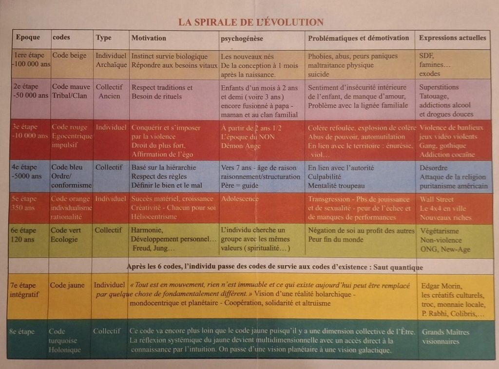 On observe une accélération constante dans l’apparition des stades de valeurs, avec un changement beaucoup plus radical qualifié de « saut quantique » au passage du 7ème niveau « code jaune », transition actuellement observable dans notre société en mutation.